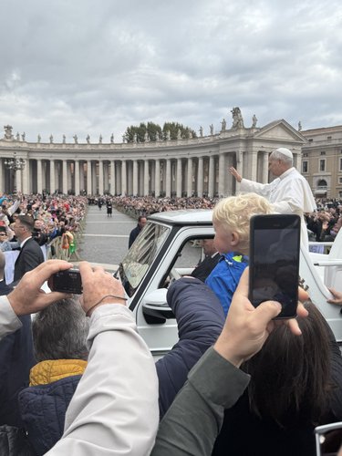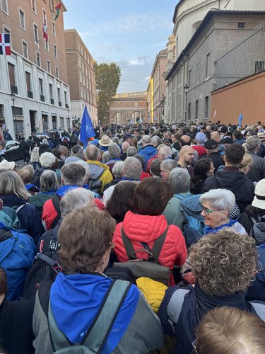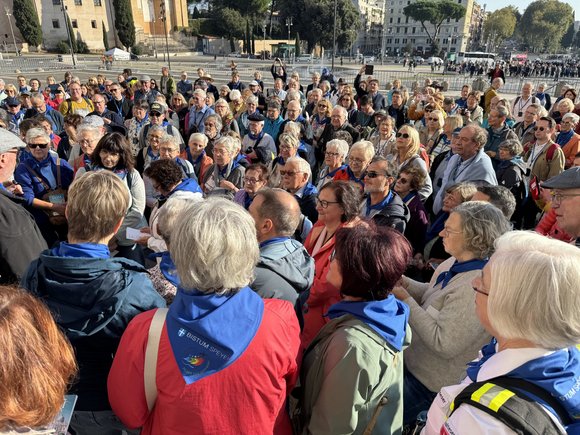 Ein wahrlich aufregender Tag liegt hinter uns oder mit anderen Worten: Dieser Tag war der Höhepunkt unserer Wallfahrt. Bereits um 6.45 Uhr ging es mit den Bussen von unseren Hotels aus los Richtung Petersplatz, denn heute stand die Generalaudienz mit Papst Leo XIV. auf dem Tagesprogramm. Neben den 357 Pilgerinnen und Pilgern aus Speyer wurden weitere 60.000 – 80.000 Gläubige erwartet. Eine unbeschreibliche Zahl, die in den vollen Straßen Roms spürbar war. Das Ziel war es natürlich: Papst Leo so nahe wie möglich zu kommen und eins oder auch zwei, oder vielleicht auch mehrere Fotos als Erinnerung mitnehmen zu können. Als wir auf dem Petersplatz ankamen, hieß es erstmal durchatmen: Die erste Hürde war geschafft. Und mit Blick auf die Uhr war auch gar nicht mehr viel Zeit, um einen guten Stehplatz zu ergattern. Kurz vor 10.00 Uhr erblickten wir ihn dann, wie er mit seinem Papamobil durch die abgesperrten Wege bis zum Petersdom fuhr. Ein wirklich besonderer Moment! Aufregung macht sich in der Gruppe breit, es wurde gejubelt und gerufen!