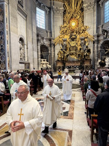 Der Morgen des zweiten Tages startete mit einem beeindruckenden und bewegenden Pilgerweg von der Engelsburg über die Via de la Conciliazione, über den Petersplatz in die Peterskirche. Gemeinsam beteten wir, verbunden über die Kopfhörer, vorne weg abwechselnd Pilgerinnen und Pilger, die ein Holzkreuz trugen und die Gruppe leiteten. Das Tragen des Kreuzes löste tiefe Berührung aus. Der Weg führte vom Obelisken auf dem Petersplatz hinein in den Petersdom durch die Heilige Pforte. Angekommen im Petersdom feierte die Reisegruppe einen Gottesdienst. Ein erhabenes Gefühl machte sich breit, in diesem denkwürdigen Dom, gemeinsam eine Messe zu feiern.