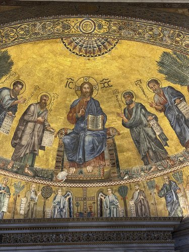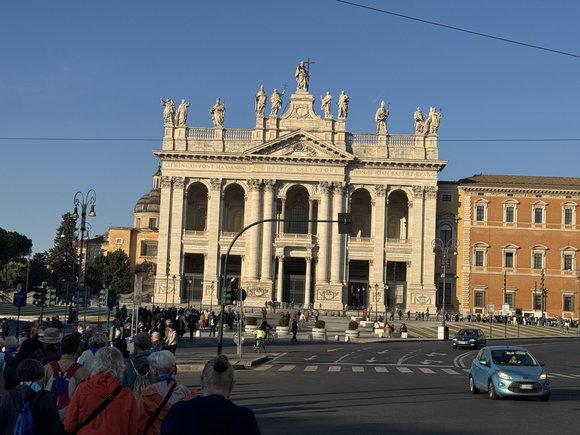 Gemeinsam unterwegs sein für die nächsten fünf Tage. Gemeinsam Glauben erleben und sich Gott näher fühlen. 357 Pilgerinnen und Pilger des Bistums Speyer haben sich auf den Weg gemacht. Und das ganz individuell – die einen zu Fuß, die anderen mit dem Bus, wieder andere mit dem Flieger. An diesem sonnigen Sonntagmorgen sind wir nun vor dem Lateran alle zusammengekommen und starten in die Wallfahrt im Heiligen Jahr 2025. Begleiten werden uns dabei immer wieder Hoffnungsklänge, das „Licht des Lebens“, die Hymne des Heiligen Jahres, mit dem wir uns mit allen Christinnen und Christen verbunden fühlen können. Eckpfeiler unserer Wallfahrt ist das Durchschreiten der Heiligen Pforten. Die erste, durch die wir in Stille laufen, ist die Porta Santa der Lateranbasilika. Anschließend findet sich Zeit, die beeindruckend verzierte Basilika zu erkunden.