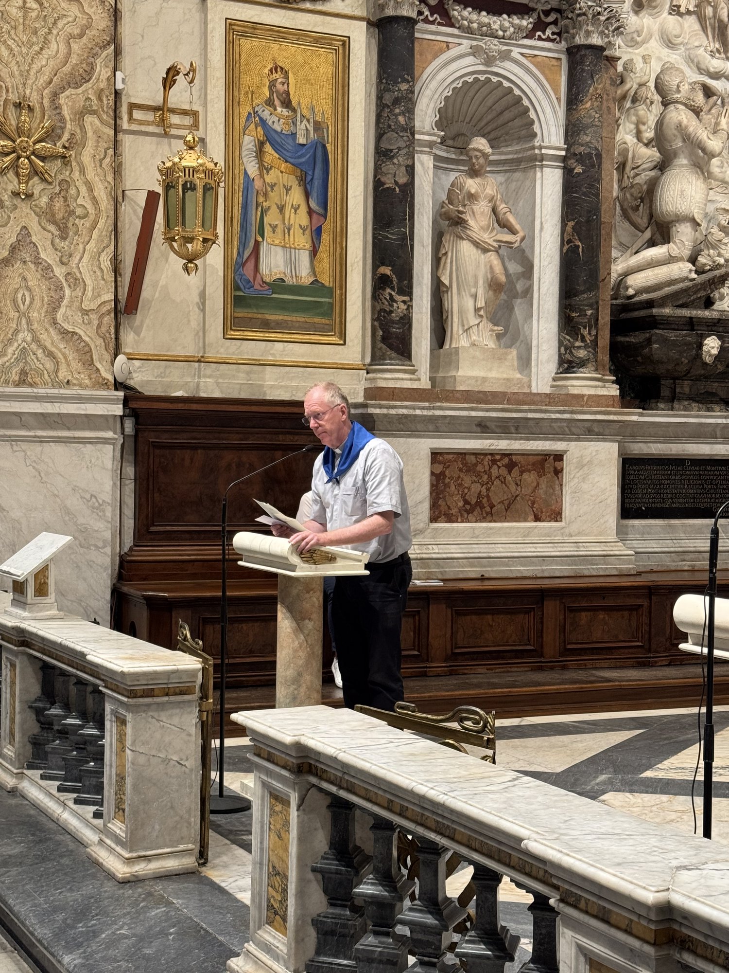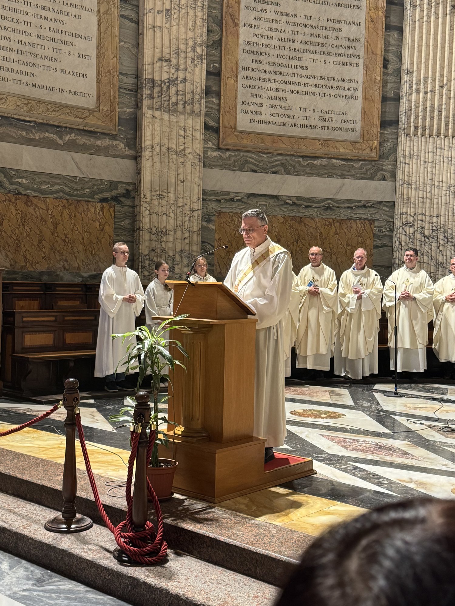 In der Kirche S. Andrea della Valle feierten wir dann zum Abschluss einen feierlichen Gottesdienst. Musikalisch erneut gestaltet von unserem Wallfahrtschor, mit Liedern, die uns die gesamte Reise bereits begleiteten. Bischof Wiesemann resümierte in seiner Predigt: „Wie reich beschenkt wurden wir mit diesen Tagen, tiefgehende Erfahrungen, die uns wieder neue Hoffnungskraft des Glaubens gegeben haben und uns zu Pilgerinnen und Pilger der Hoffnung machen. Wie die Kirche lebt, wie der Glaube lebt, das durften wir in diesen Tagen in Rom, als Ort der Kirche der ganzen Welt, erleben.“