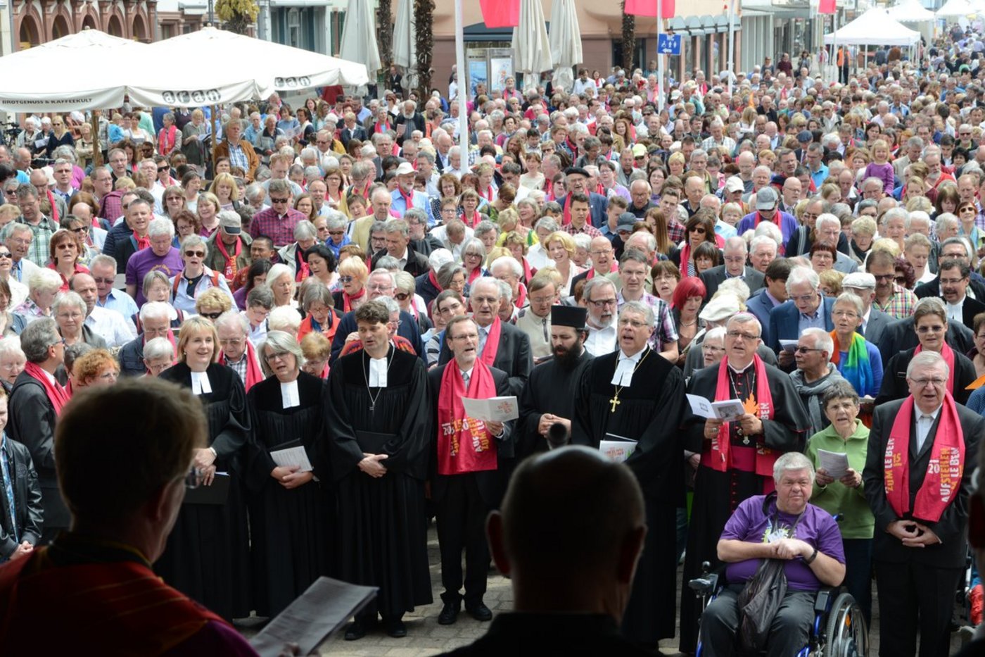 Christen unterschiedlicher Konfessionen stehen im Freien, feiern gemeinsam Gottesdienst und begegnen einander